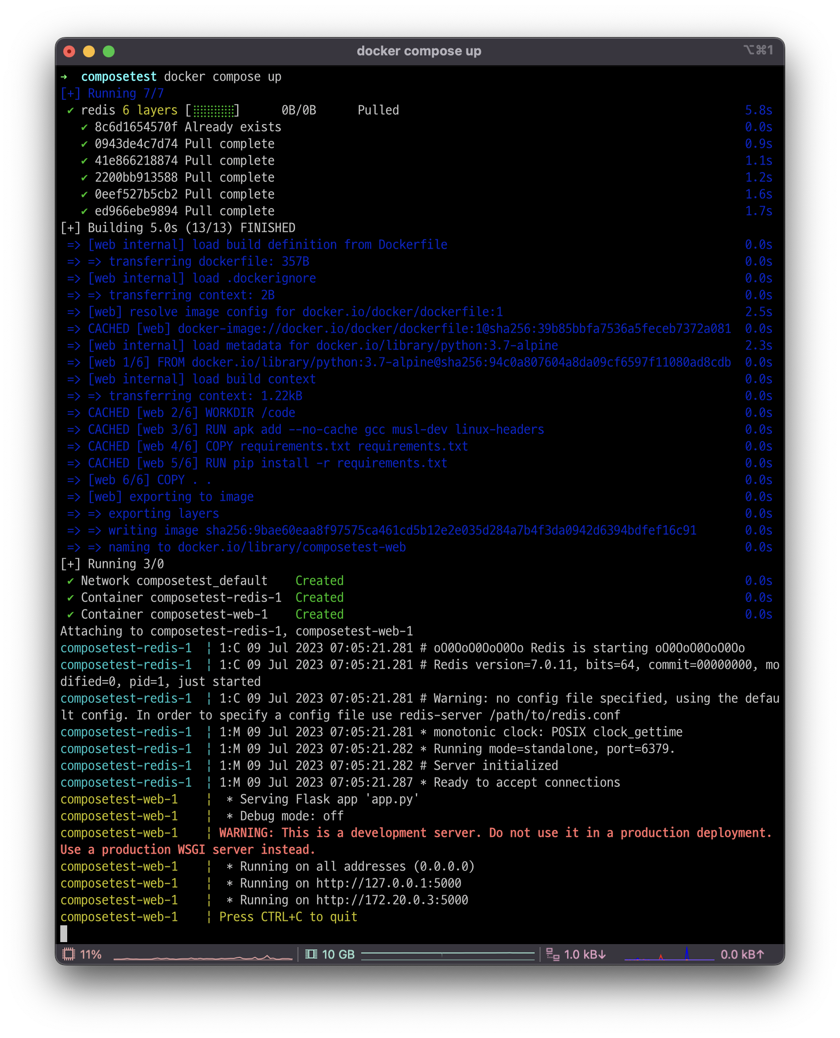오류가 없다면 아래와 같이 빌드되고 flask app이 실행하는 모습을 볼 수 있다.