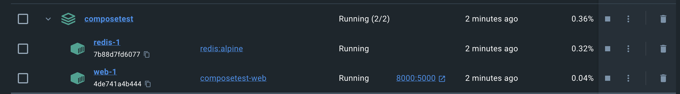 그리고 docker desktop에서 아래와 같이 'web', 'redis'라는 이름으로 실행중인 컨테이너를 볼 수 있다.