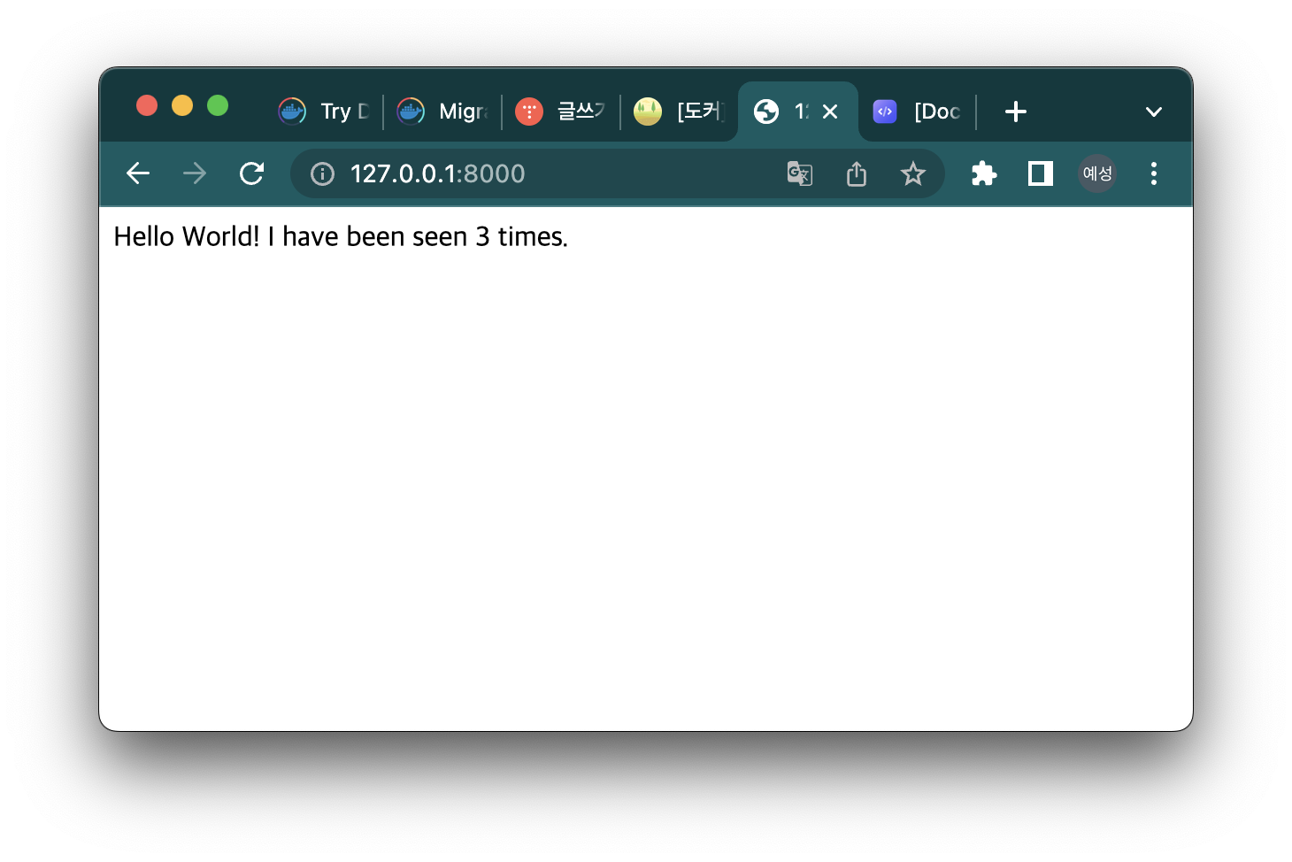 '127.0.0.1:8000'에 접속한다면 새로고침 할 때마다 방문 수가 증가하는 웹 서비스를 볼 수 있다.
