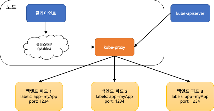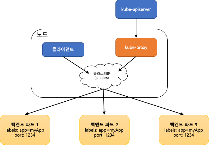 클라이언트가 Service의 ClusterIP를 통해 요청을 하면 iptables을 거쳐 kube-proxy가 요청을 받는다.